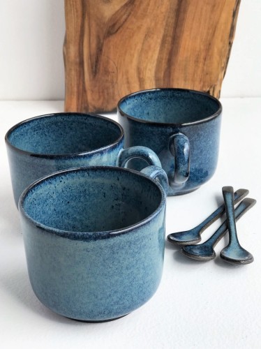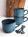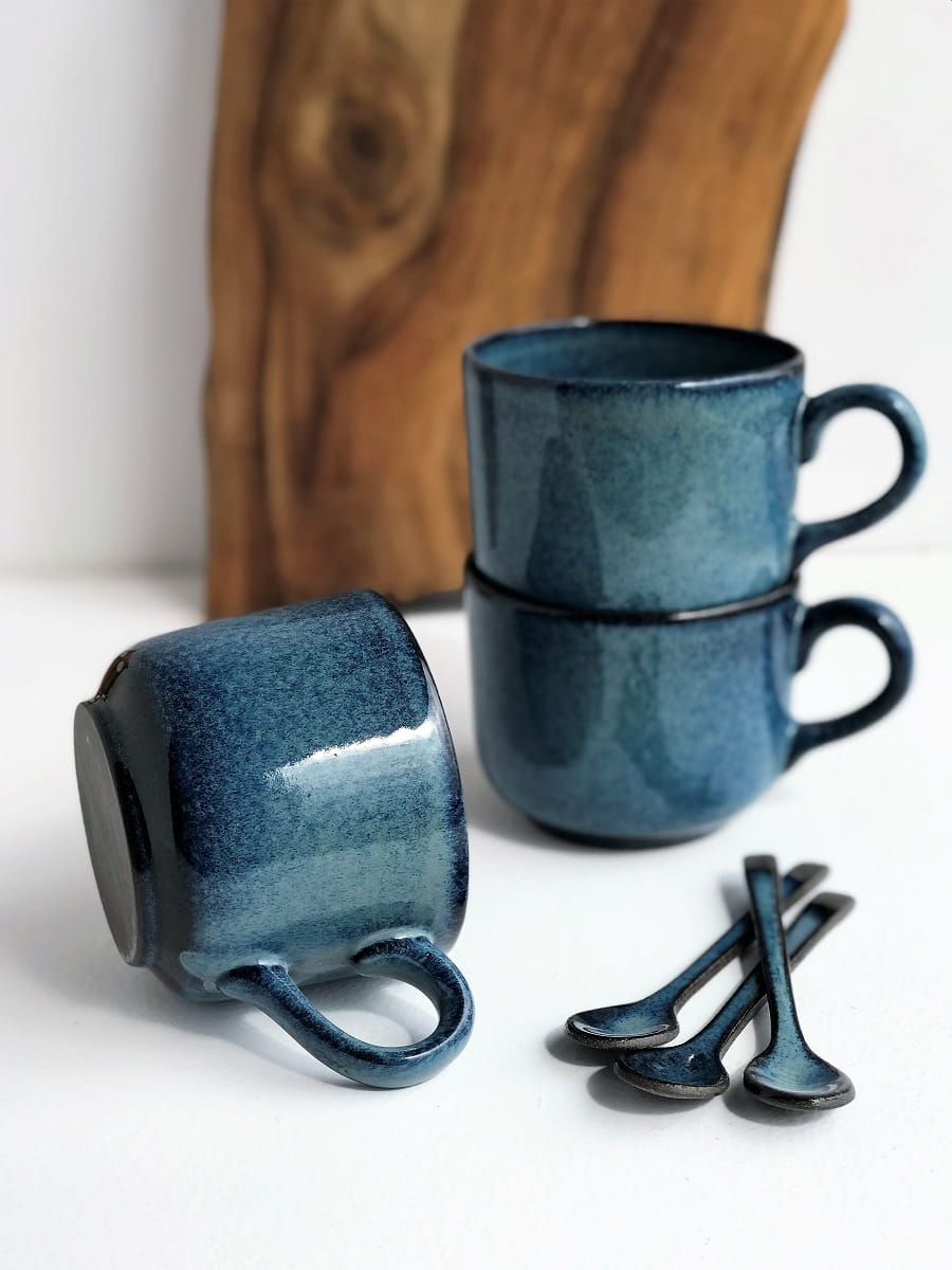 Filiżanka pokryta jest szkliwami spożywczymi w odcieniach: niebieskiego, granatu oraz czerni na obrzeżach.