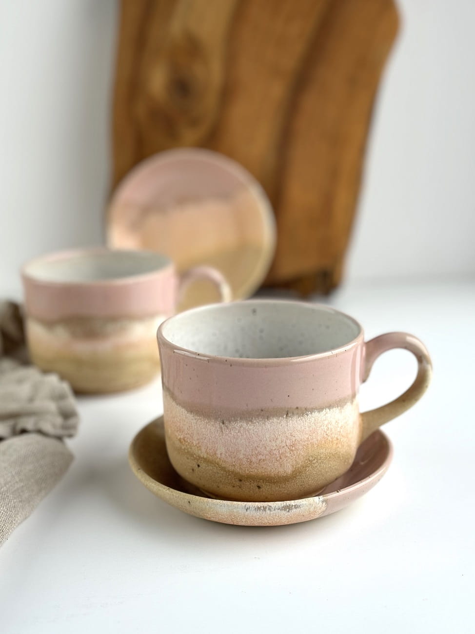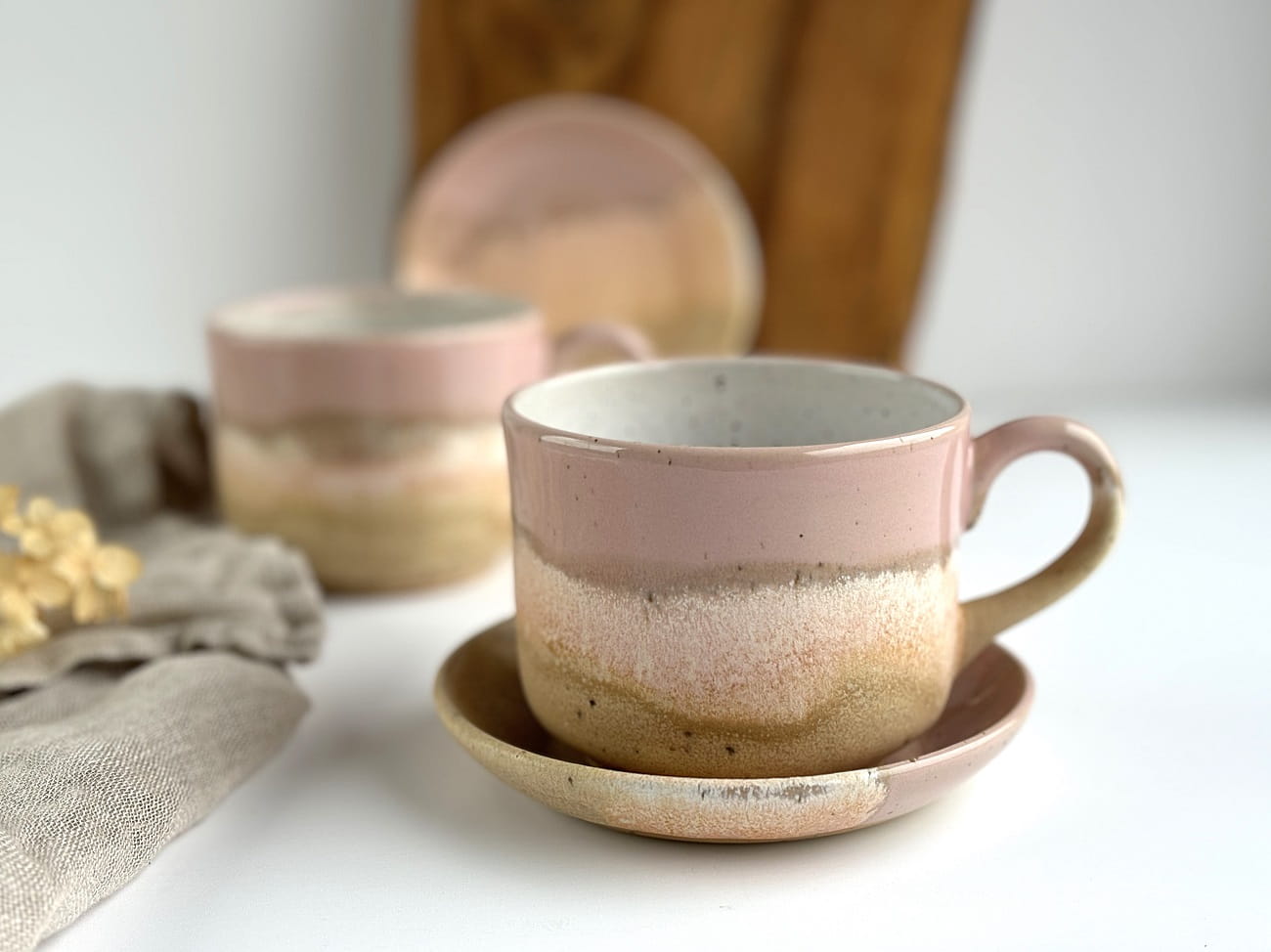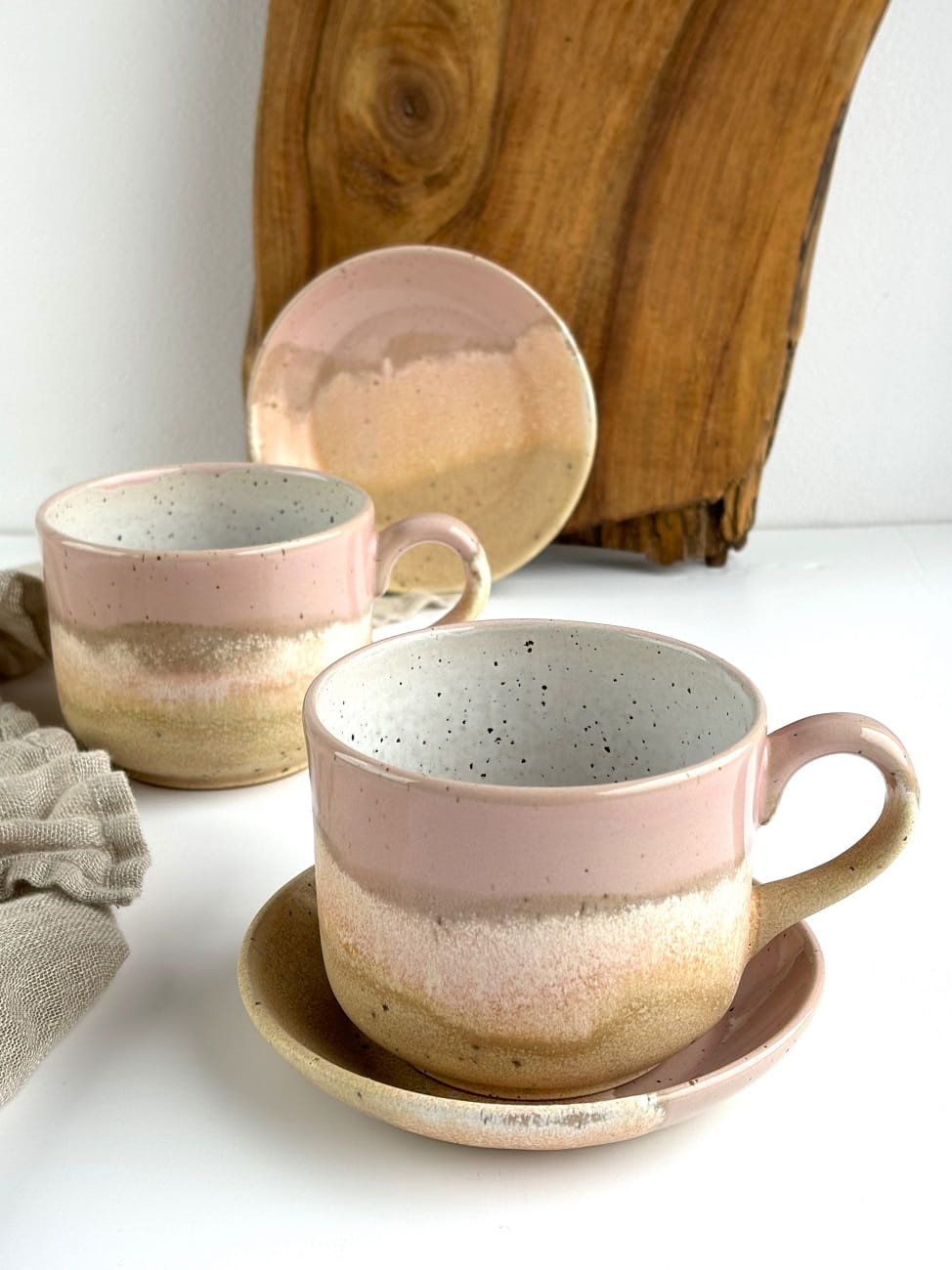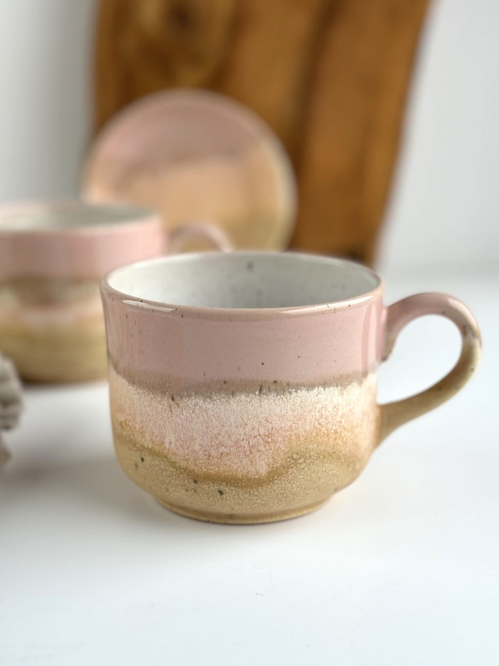 Pięknie przenikające się odcienie delikatnego różu oraz odcieni piasku na beżowej masie ceramicznej.