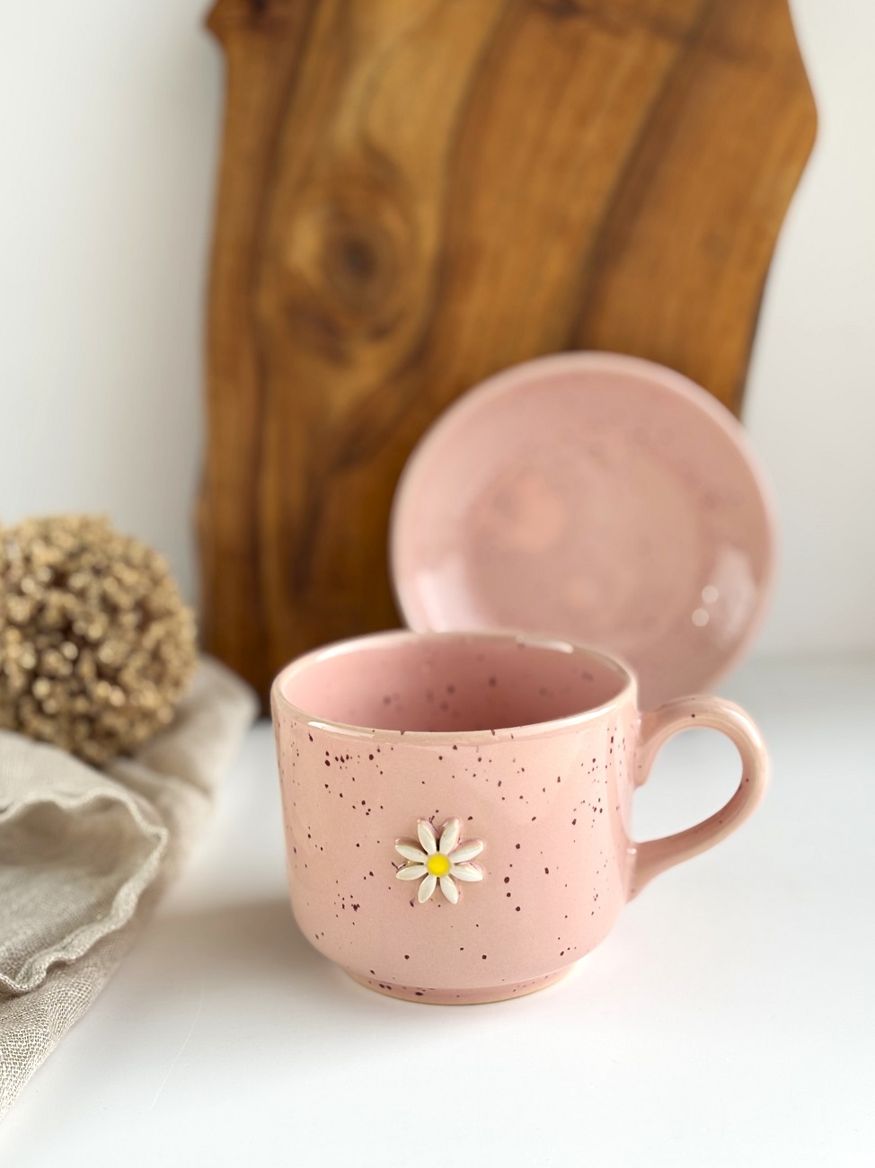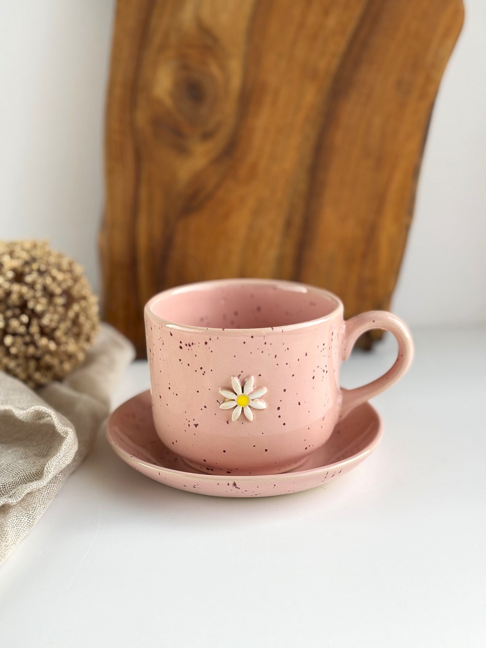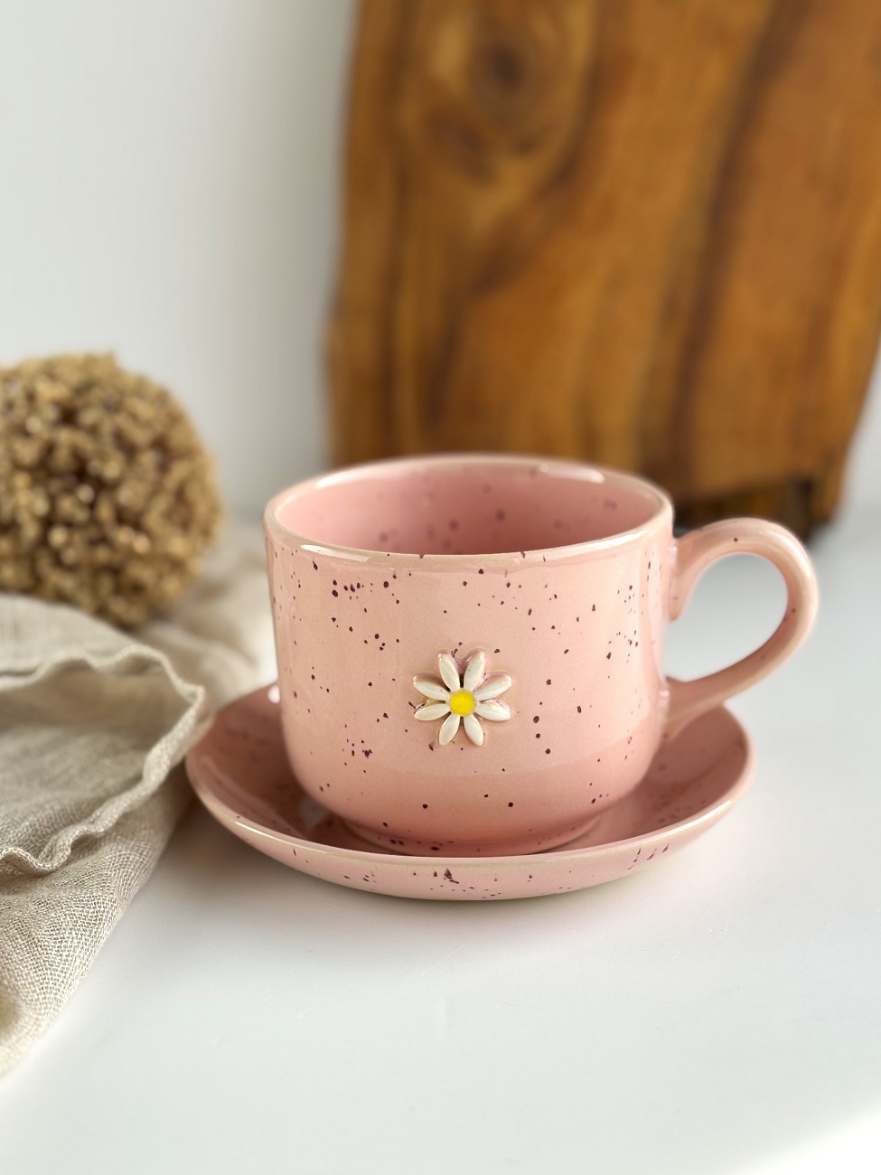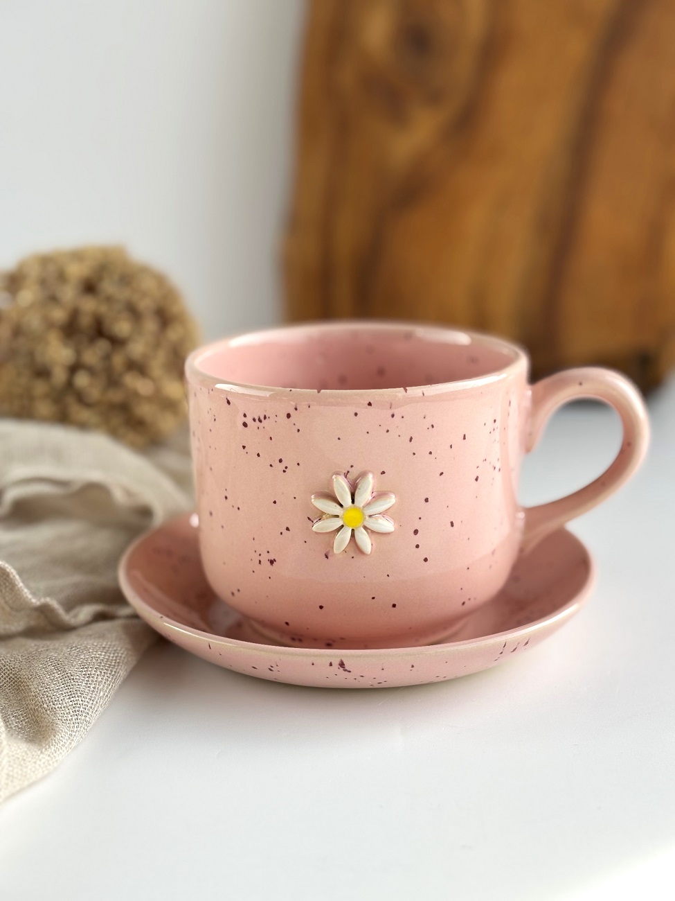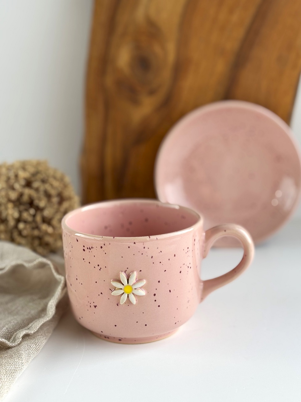 Duża ręcznie robiona duża filiżanka ceramiczna ze spodkiem 350 ml - Stokrotka różowa