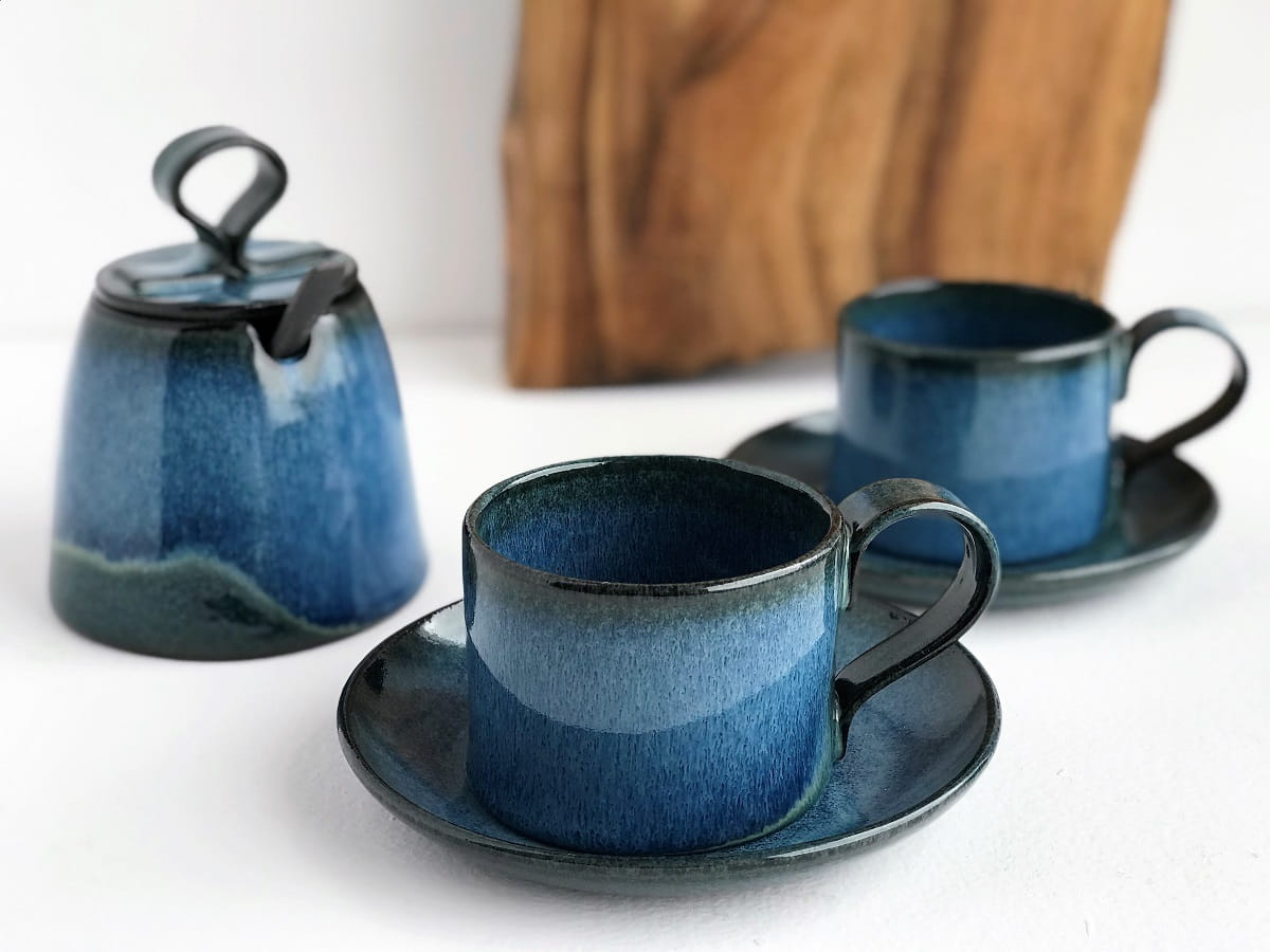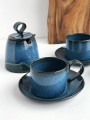 Ręcznie robiona niebieska filiżanka ceramiczna ze spodkiem z kolekcji Borówka.