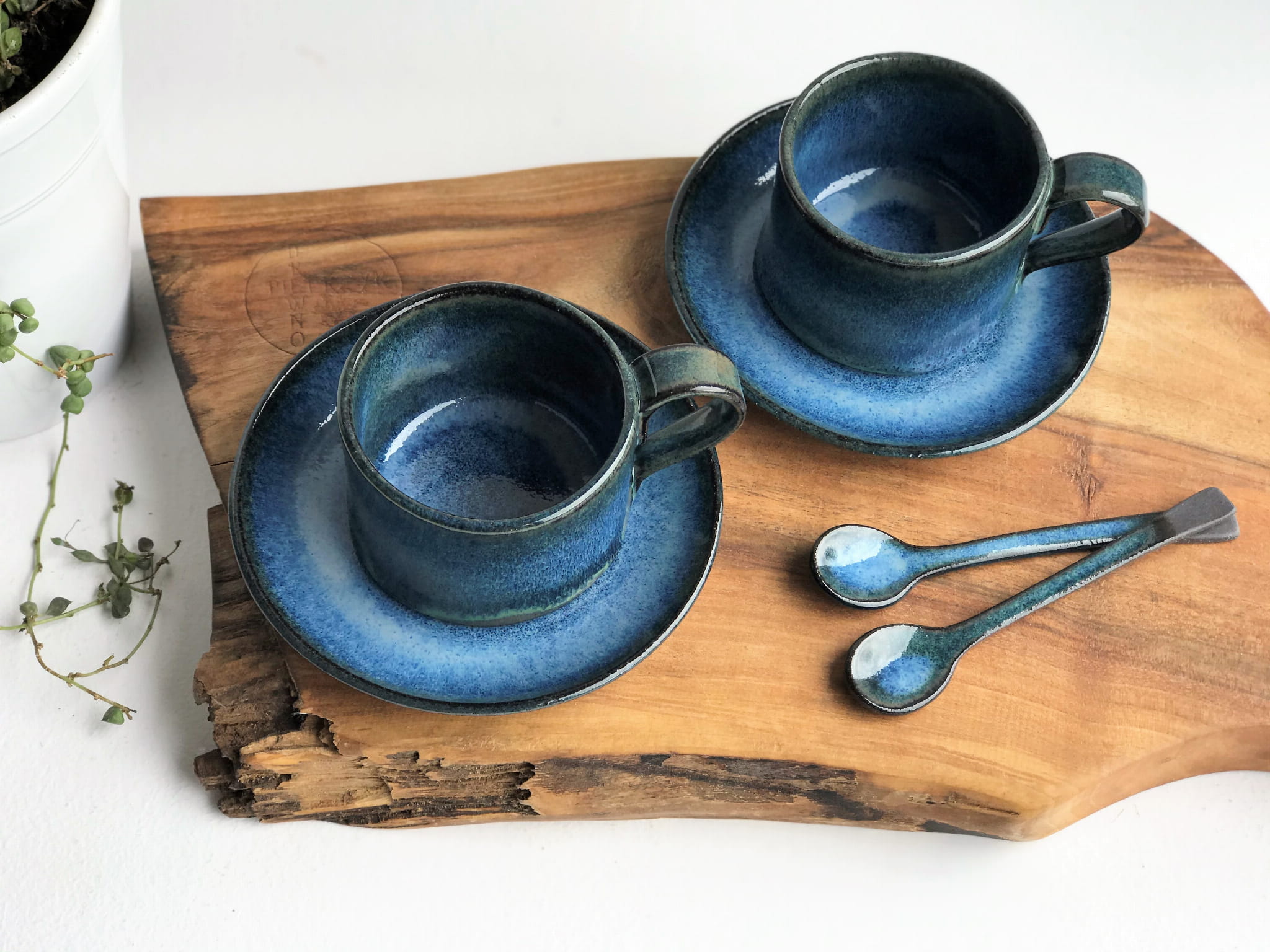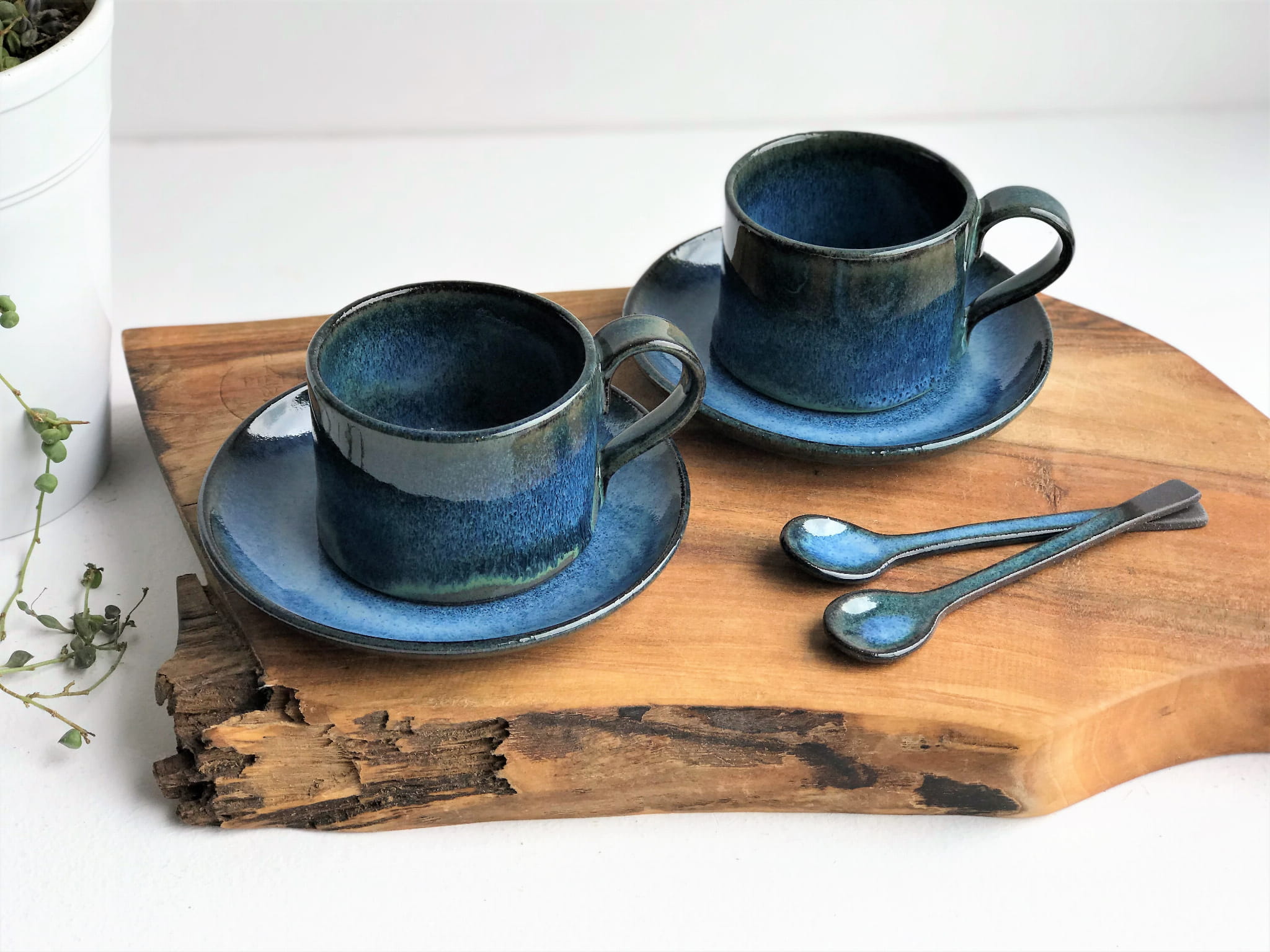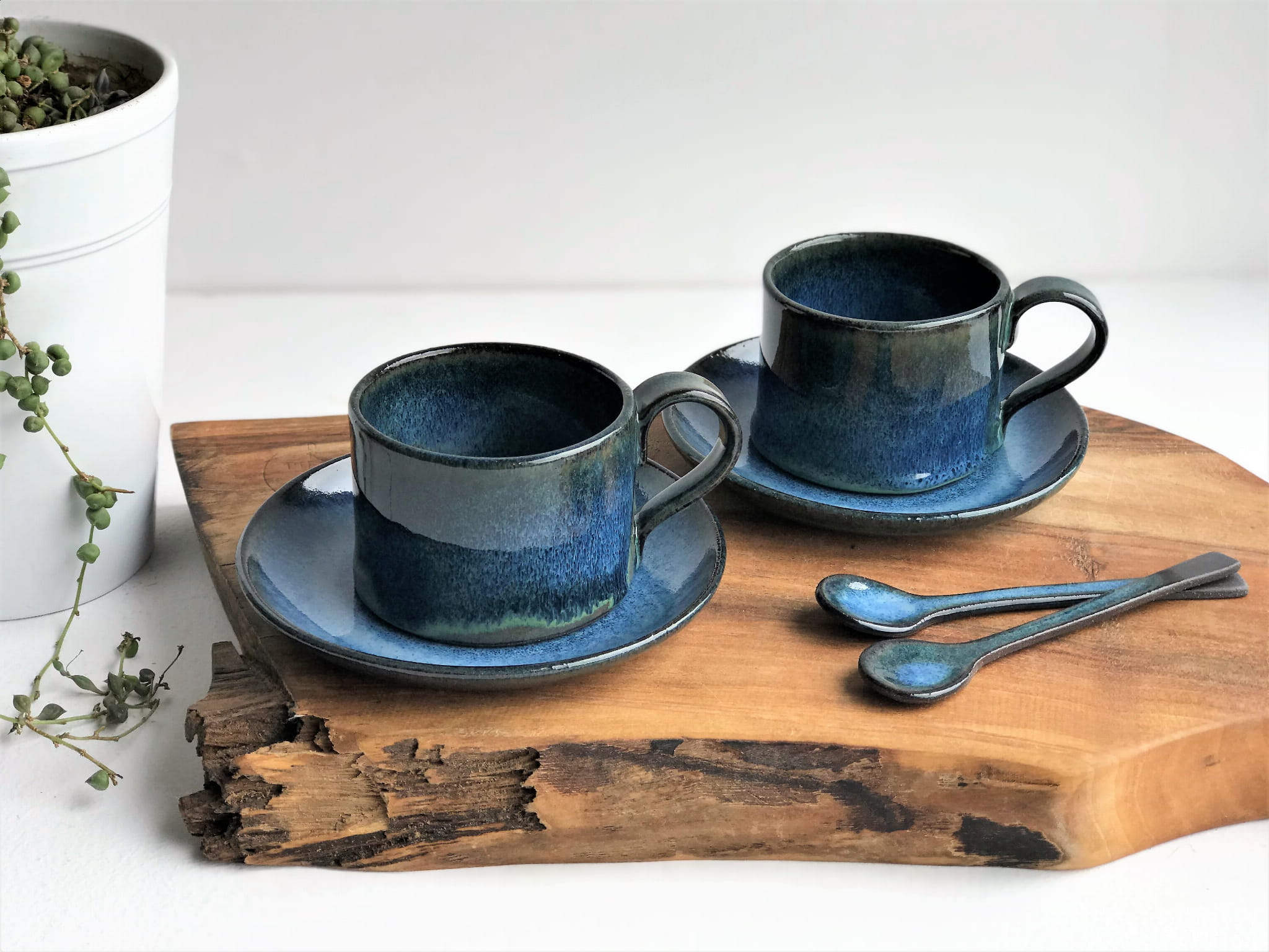 Ręcznie lepiona filiżanka ceramiczna ze spodeczkiem plus łyżeczki - zestaw dla 2 osób.