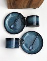 Filiżanka i spodek pokryte są szkliwem spożywczym w odcieniach: niebieskiego, granatu, oraz czerni na obrzeżach.