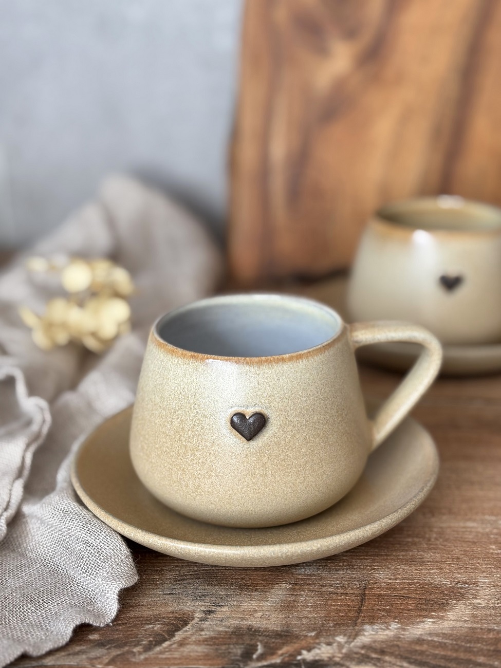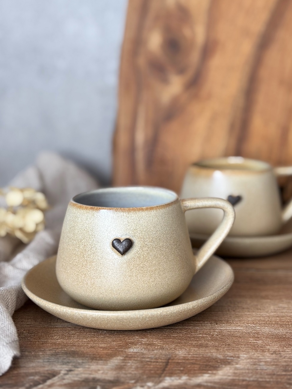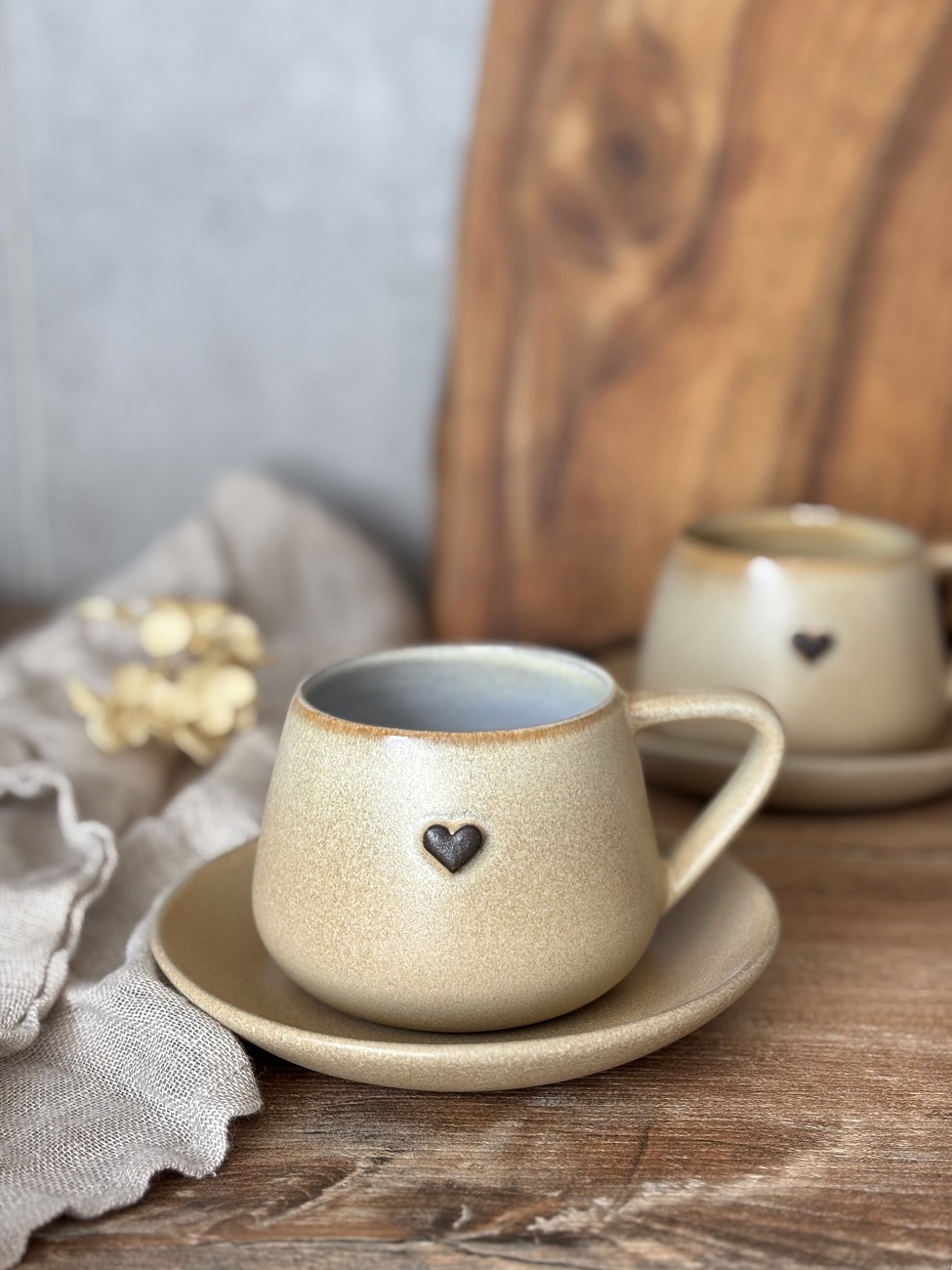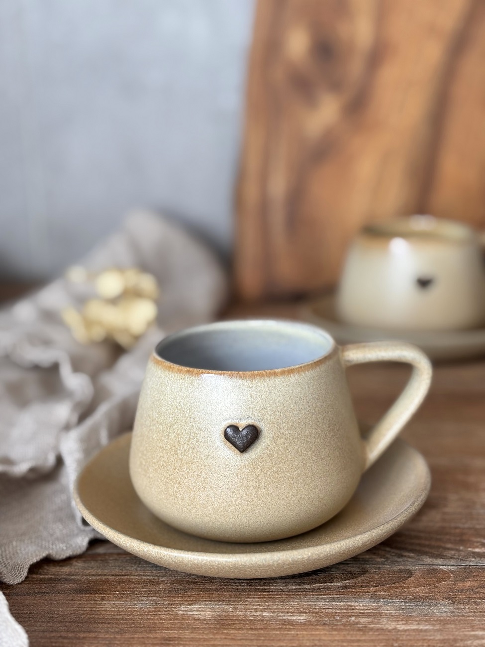 Ręcznie robiona filiżanka ceramiczna ze spodeczkiem - Pustynny piach z sercem