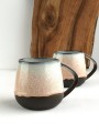 Szkliwo w kolorze jasnego beżu z ciemniejszymi centkami na ciemnoczekoladowej masie ceramicznej.