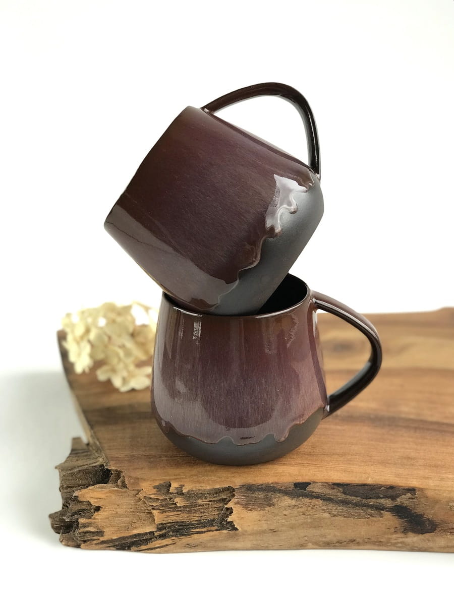 Szkliwo w kolorze gorzkiej czekolady na ciemnej masie ceramicznej.