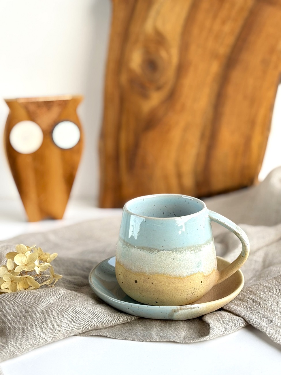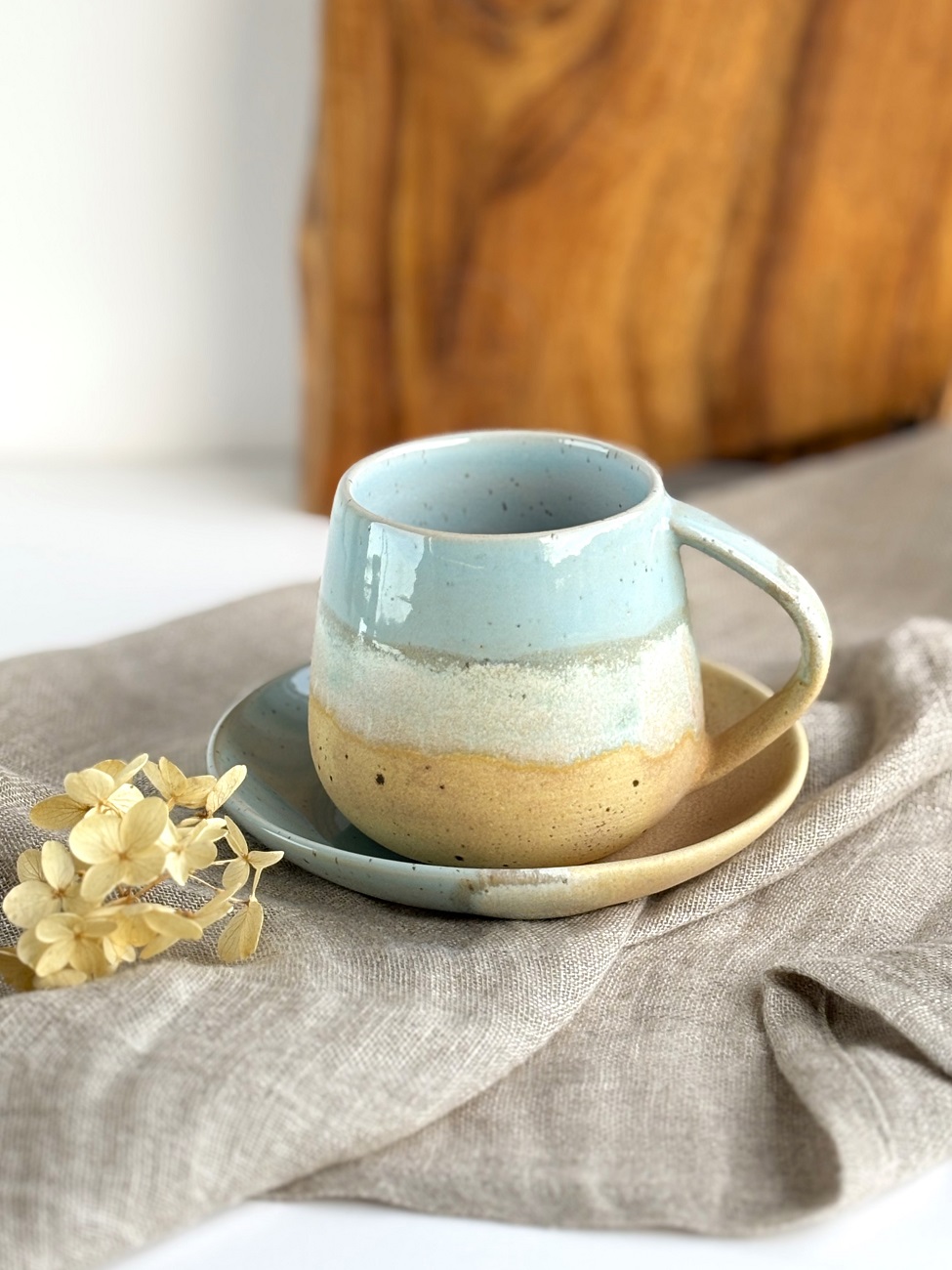 Ręcznie robiony kubek ceramiczny / duża filiżanka beczułka ze spodkiem -Niebieskie migdały.