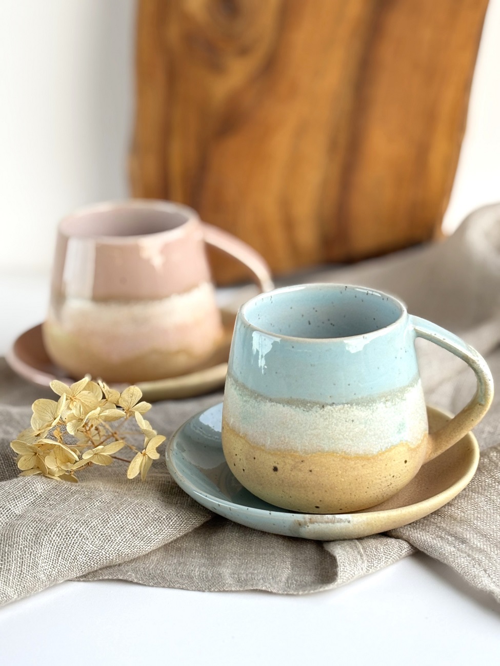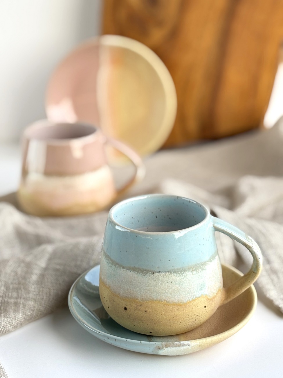 Szkliwo jasnoniebieskie na beżowej masie ceramicznej z drobinkami bazaltu tworzącymi piegi, pięknie przenikające się odcienie delikatnego różu oraz szkliwa w odcieniach piasku.