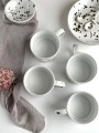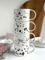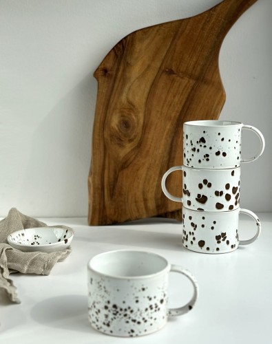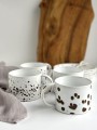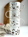 Filiżanki ceramiczne pokryte są szkliwami spożywczymi w bieli z licznymi nakropieniami w czerni.