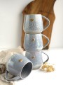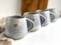 Kubki wykonane są z jasnej masy ceramicznej z drobinkami bazaltu, które wybarwiają się na szkliwie jako drobne piegi.