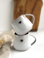 Filiżanki wykonane są z ciemnoczekoladowej masy ceramicznej i pokryte białym szkliwem z nakropieniami.