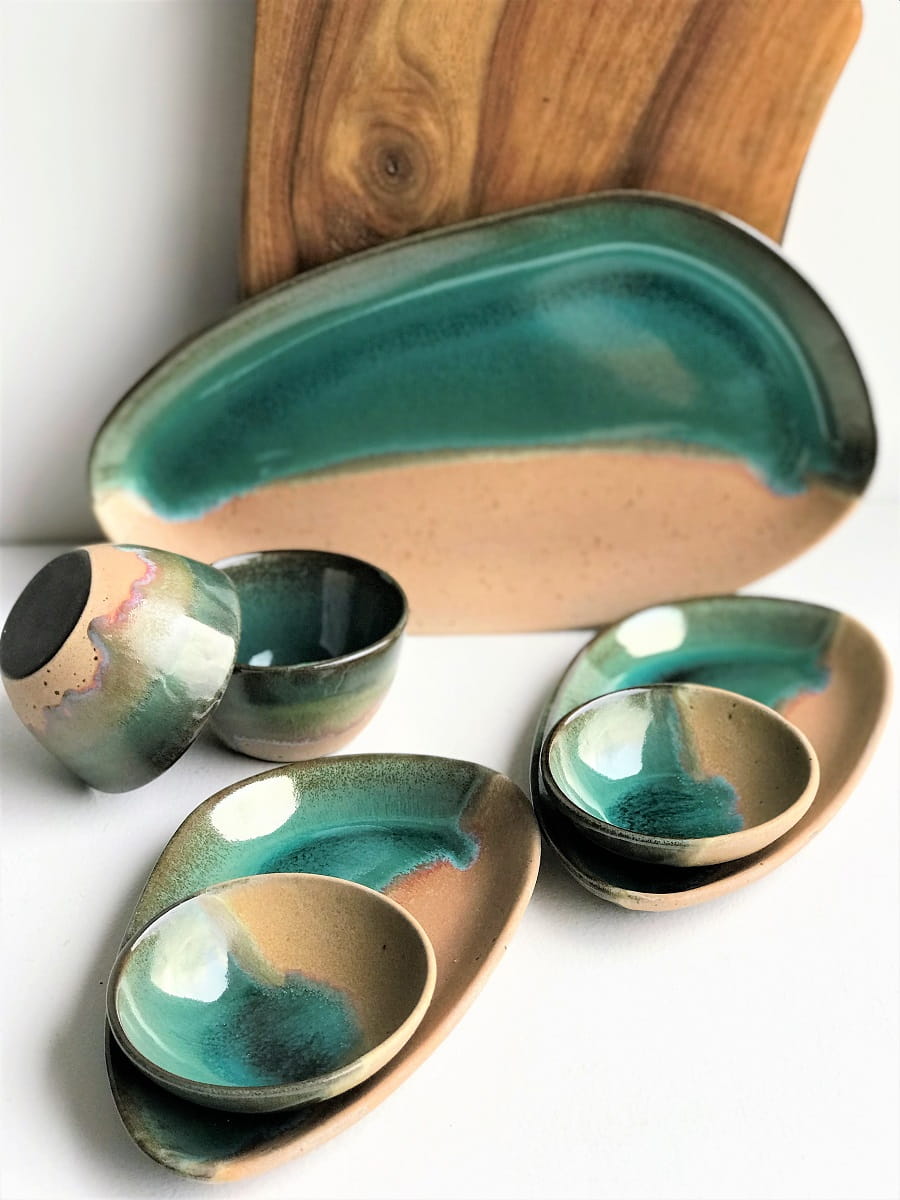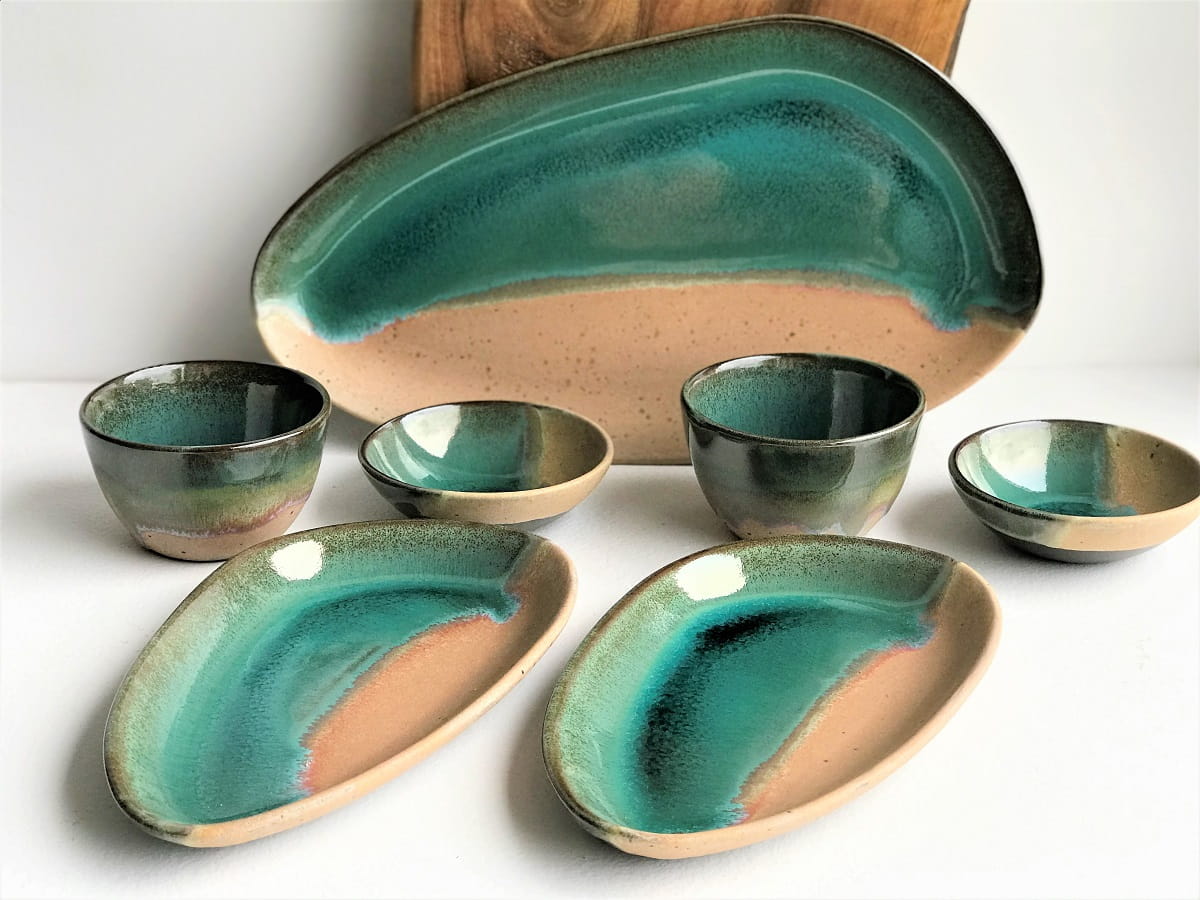 Ręcznie lepiony zestaw ceramiczny w skład którego wchodzą - duża patera, patera mała - 2 szt, miseczka - 2 szt, czarka - 2 szt