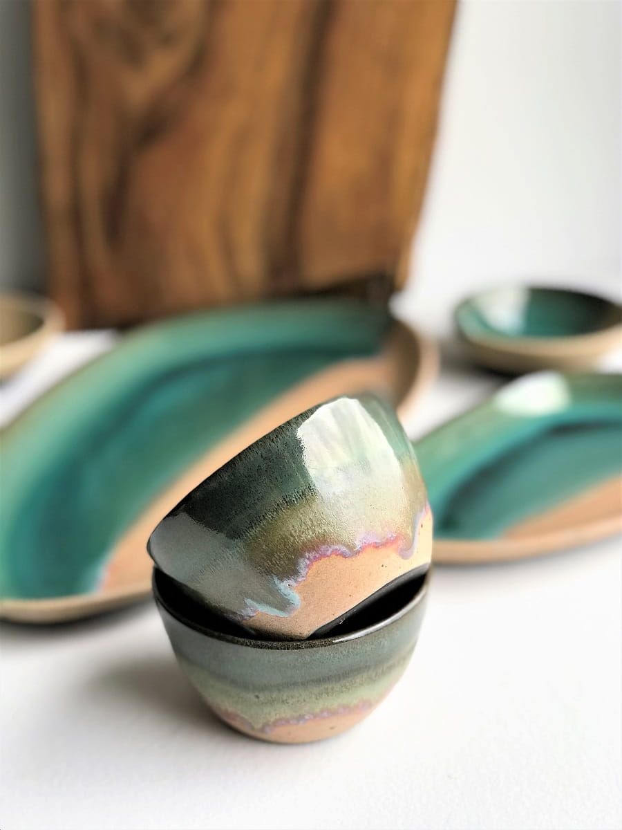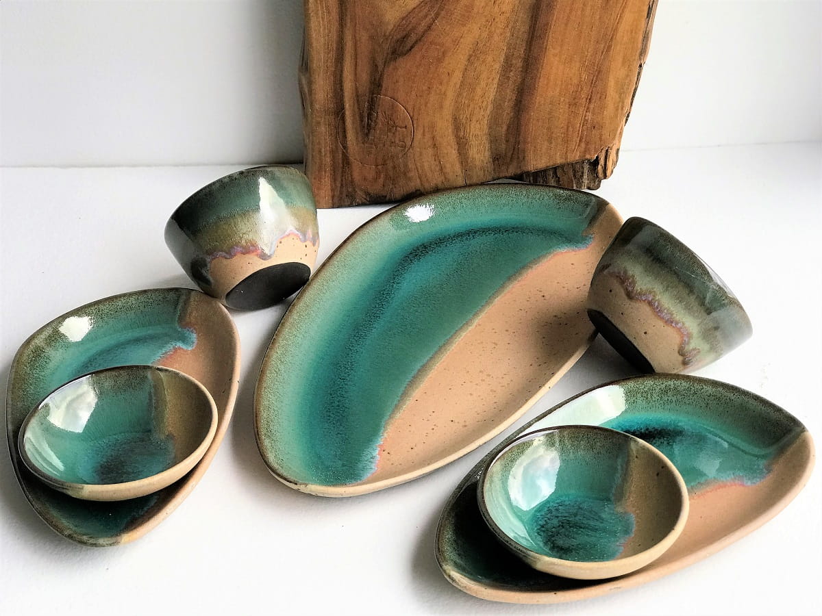 Naczynia wykonane są z ciemnoczekoladowej gliny i pokryte szkliwami w odcieniach morsko-turkusowym oraz piaskowym.
