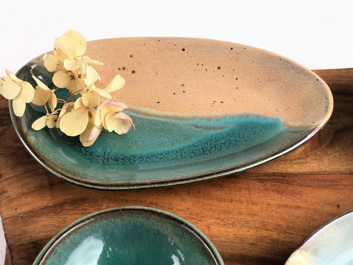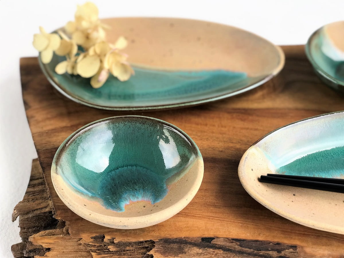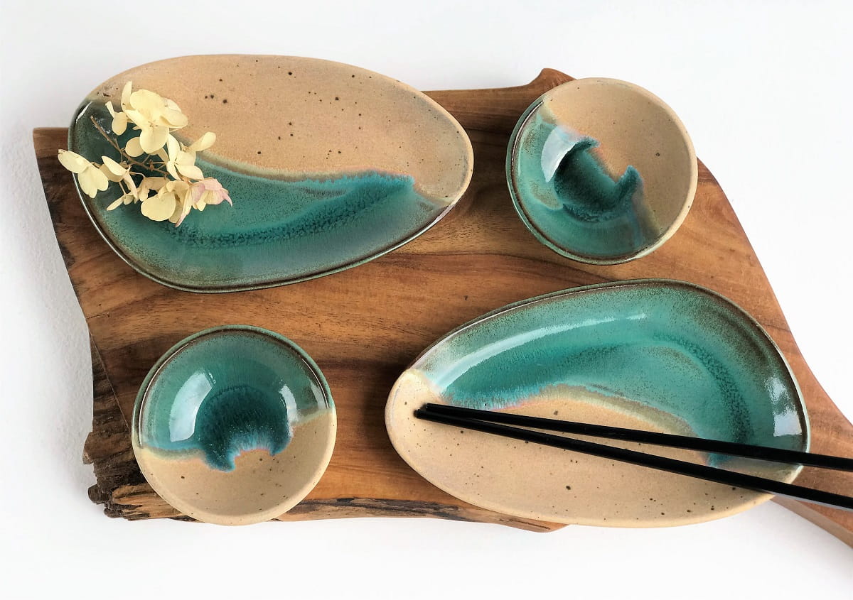 Naczynia wykonane są z ciemnoczekoladowej gliny i pokryte szkliwami w odcieniach morsko-turkusowym oraz piaskowym.