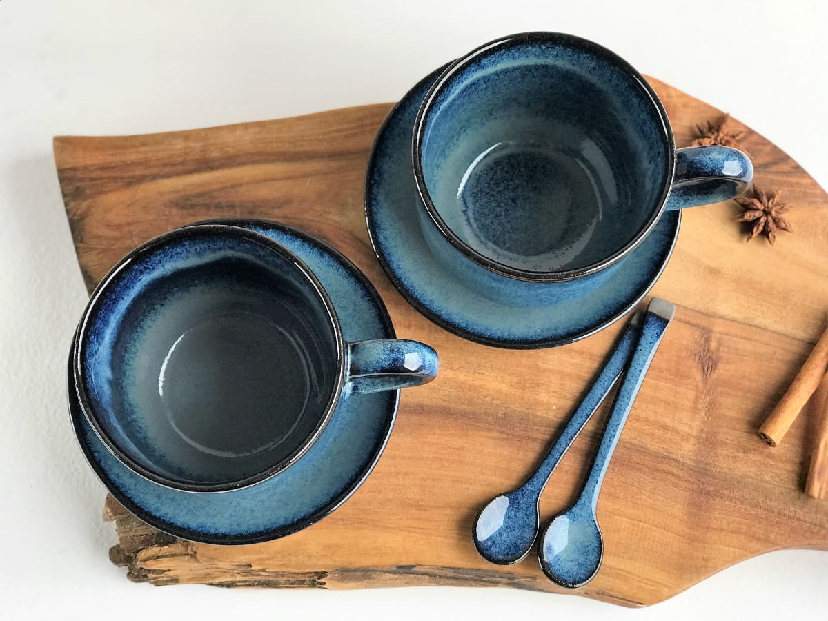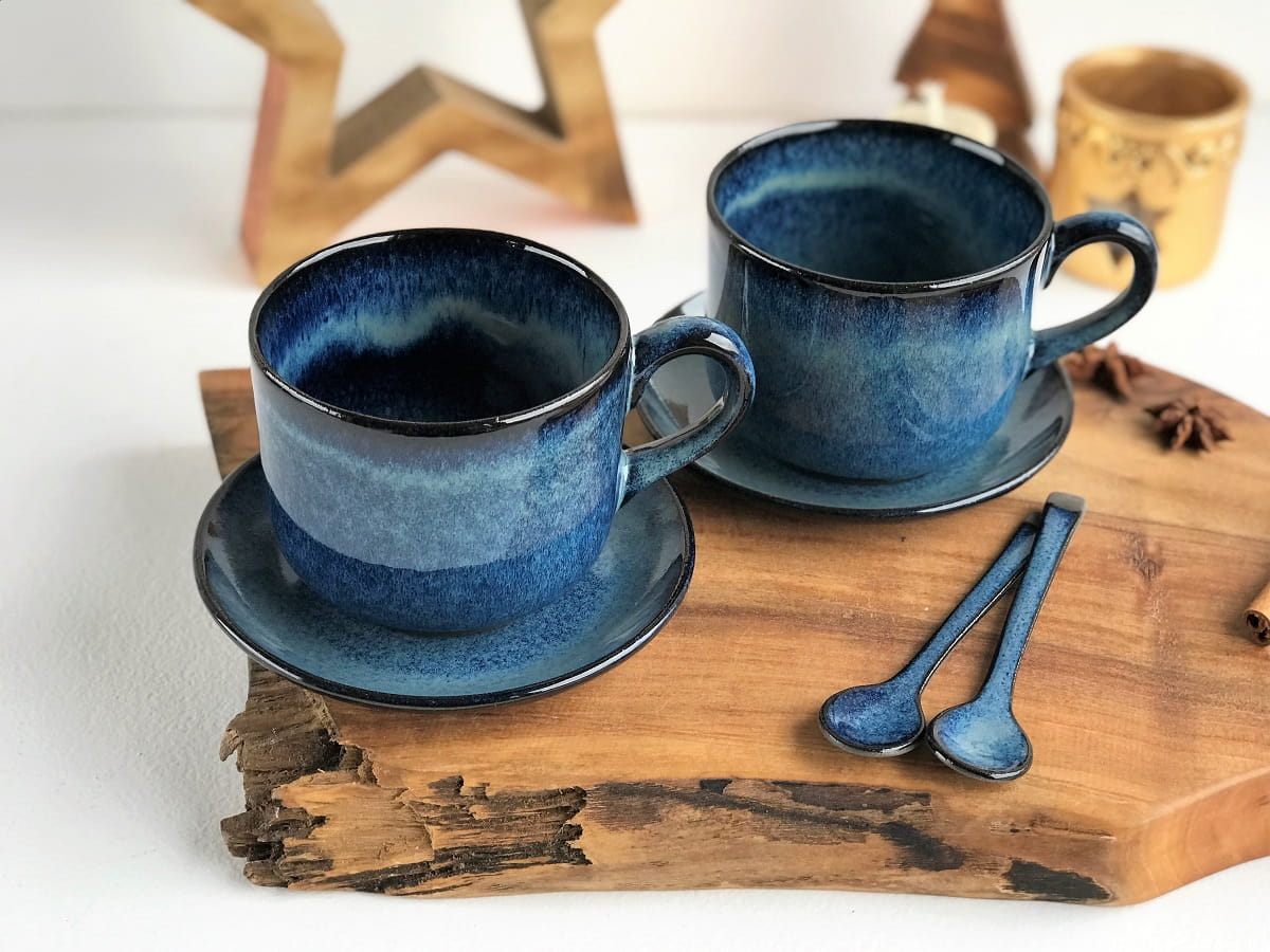 Filiżanka pokryta jest szkliwami spożywczymi w odcieniach: niebieskiego, granatu oraz czerni na obrzeżach.