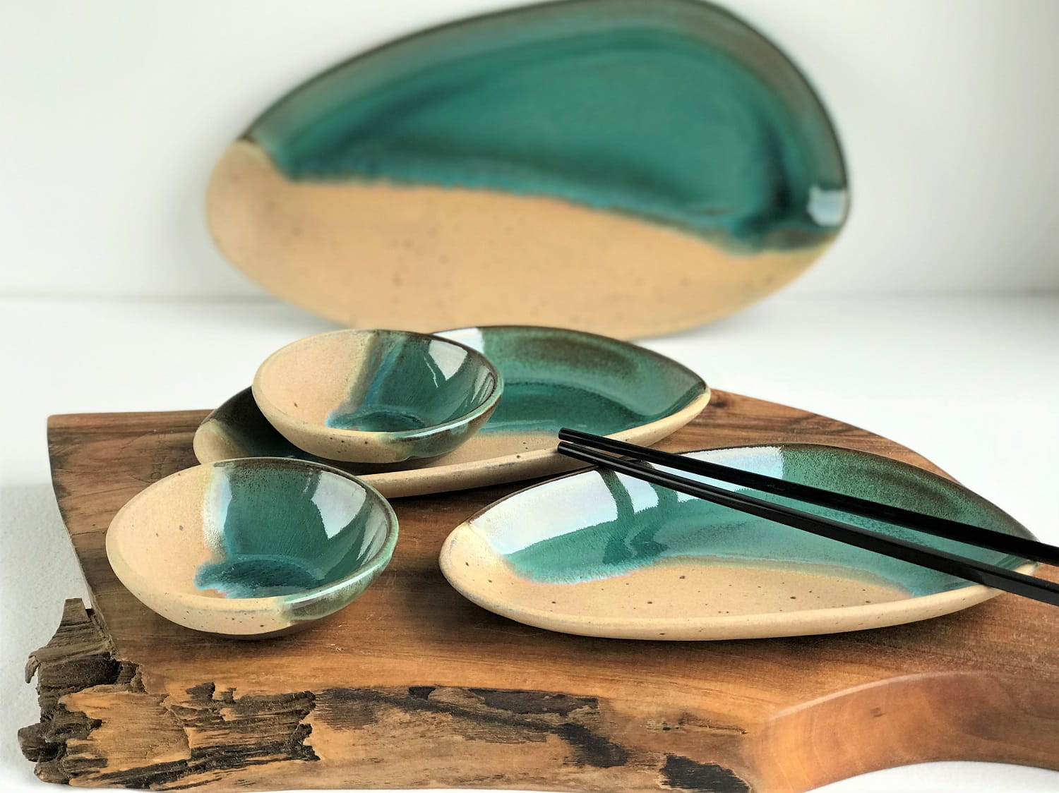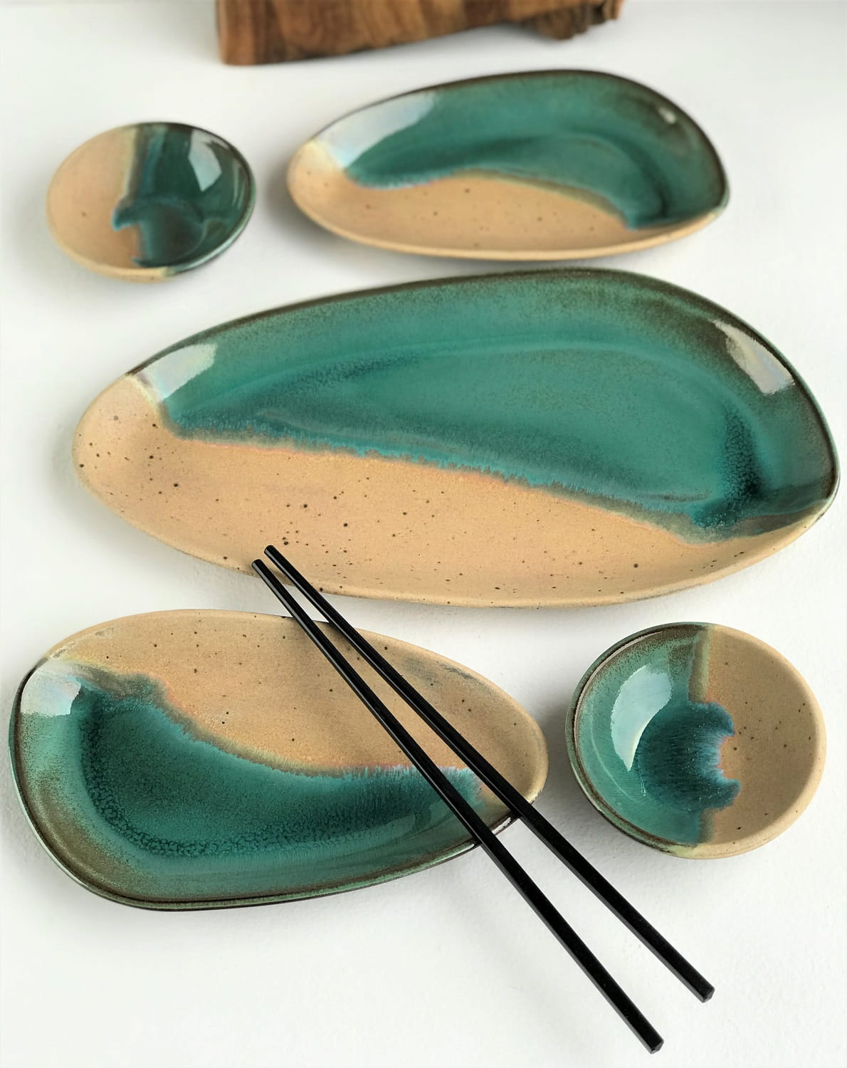 Naczynia wykonane są z ciemnoczekoladowej gliny i pokryte szkliwami w odcieniach morsko-turkusowym oraz piaskowym.