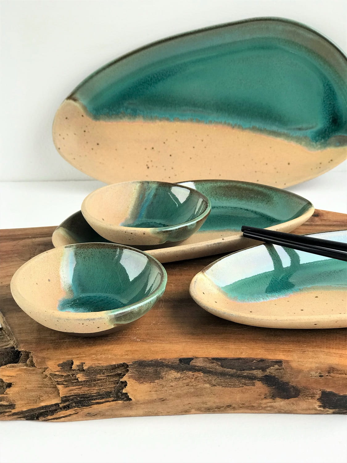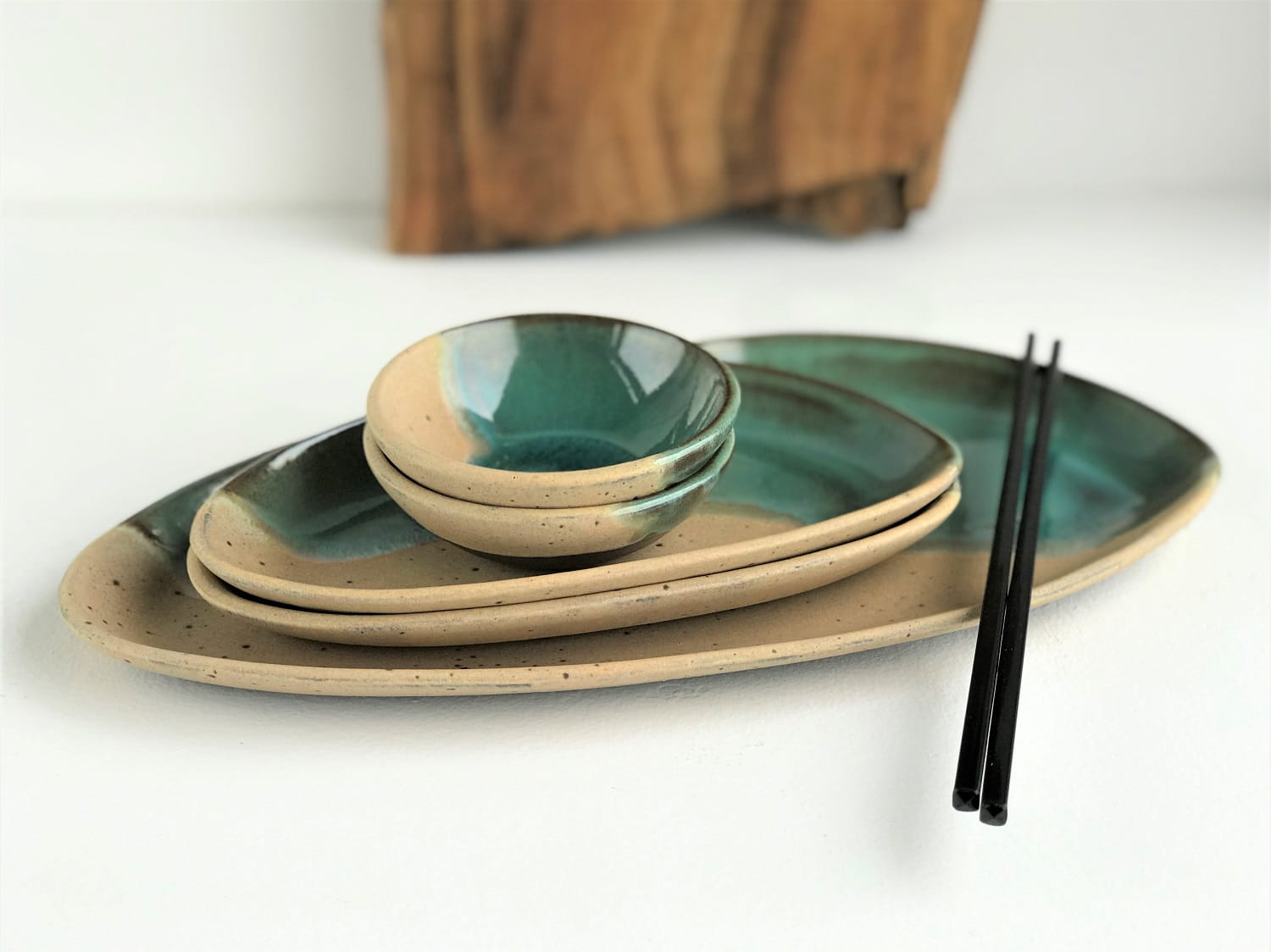 Ręcznie lepiony zestaw ceramiczny w skład którego wchodzą - duża patera, patera mała - 2 szt, miseczka - 2 szt