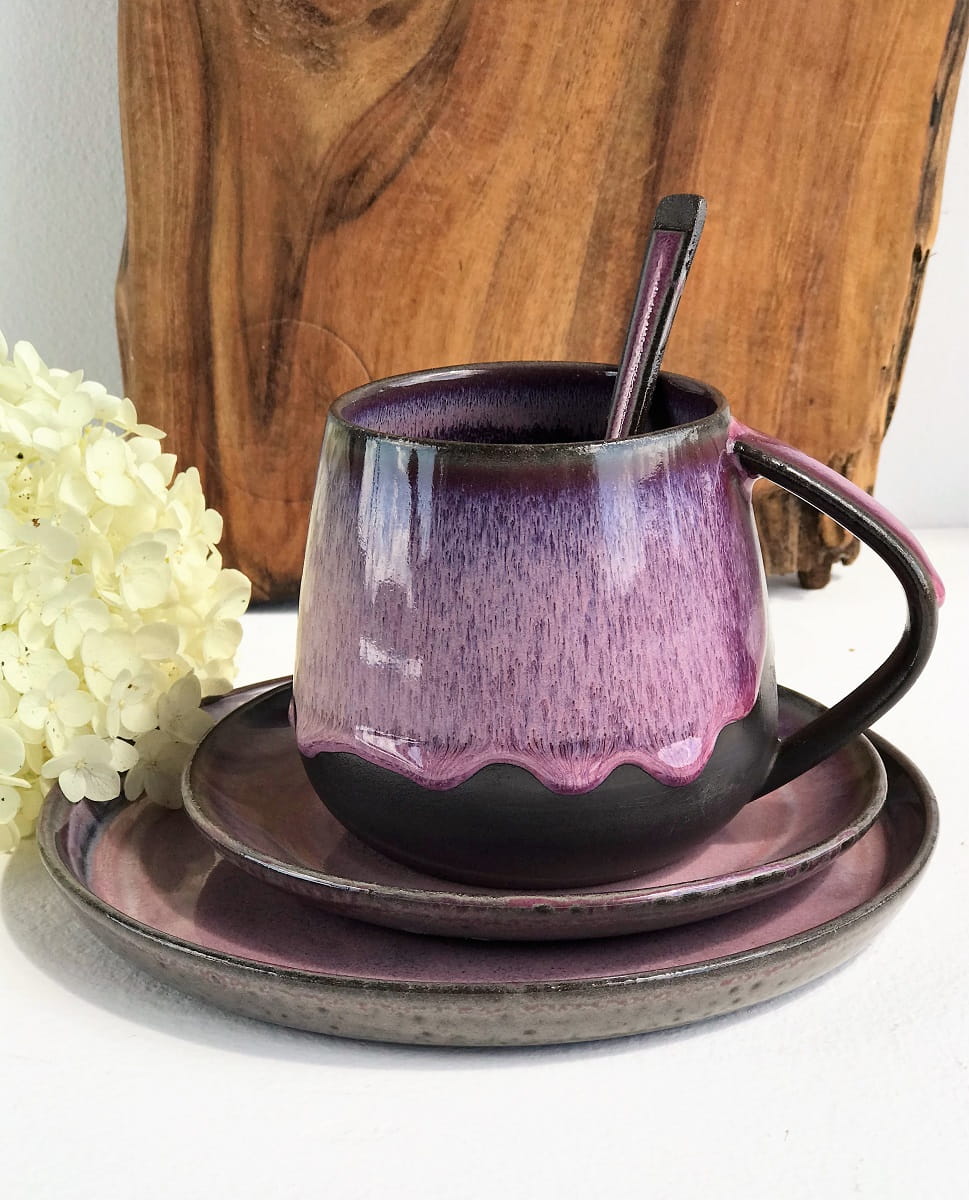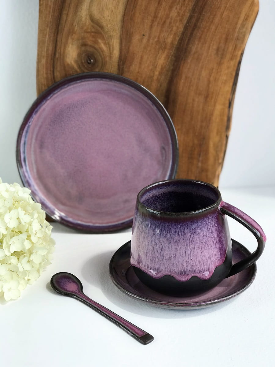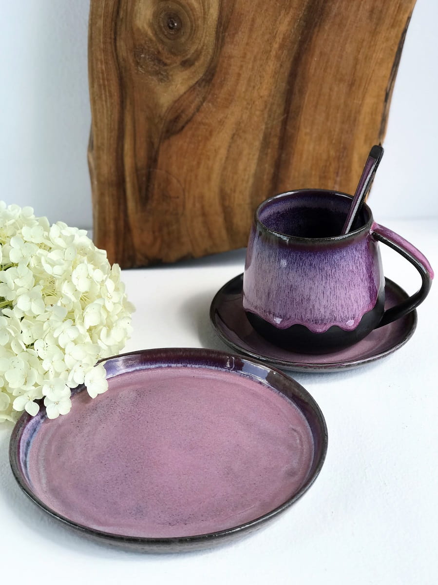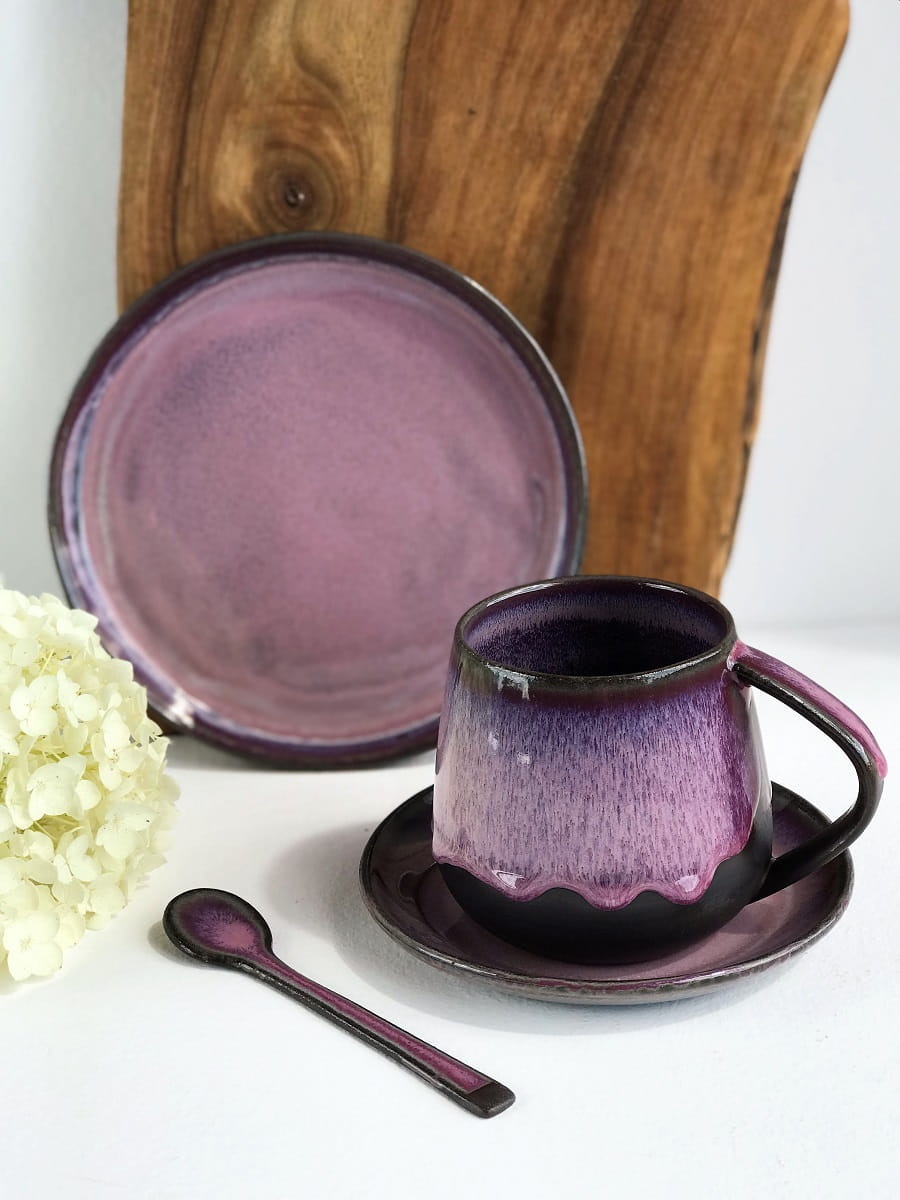 Zestaw wykonany jest z czekoladowo-brązowej masy ceramicznej i pokryty szkliwami w odcieniach różu i fioletu.