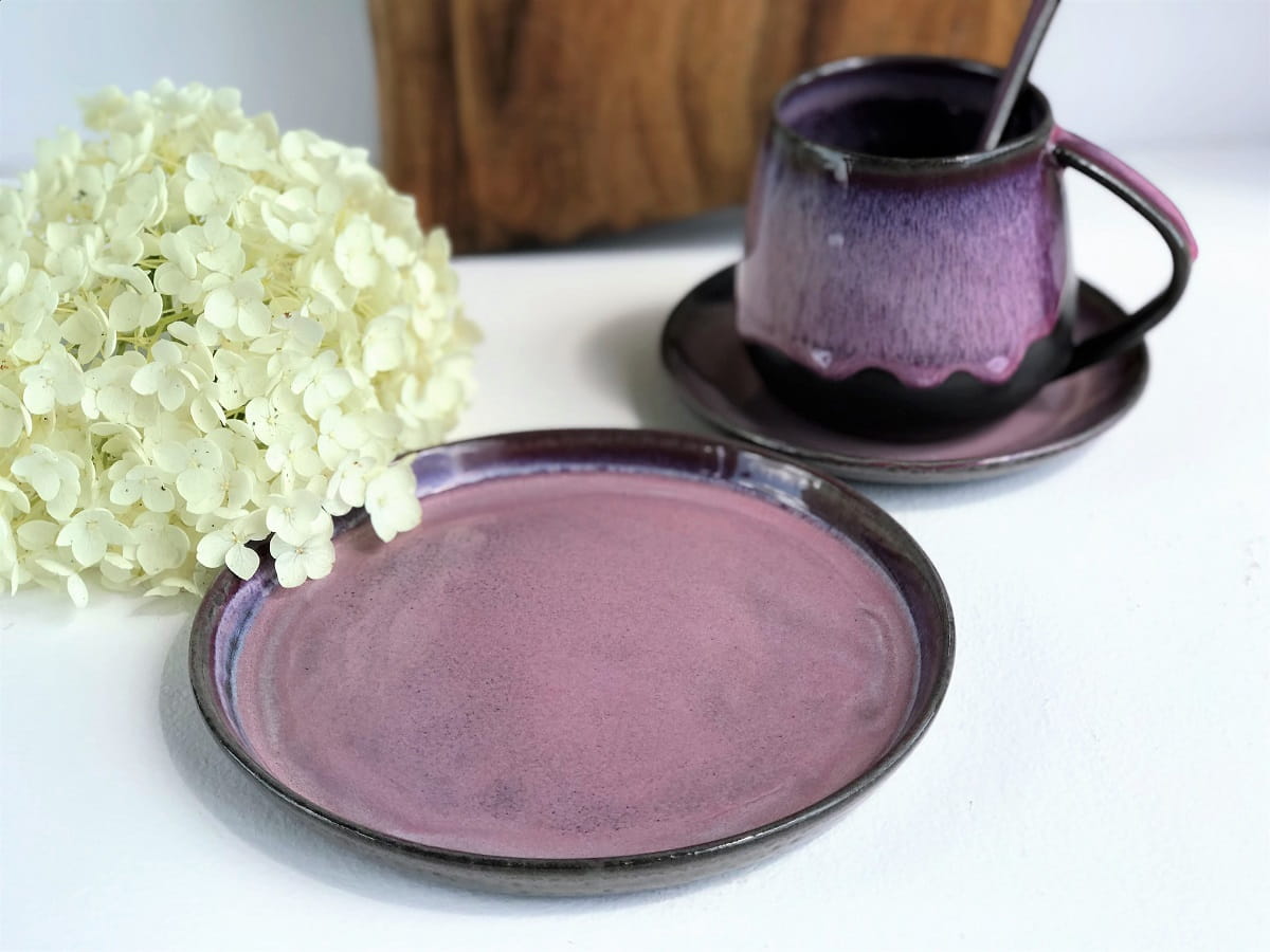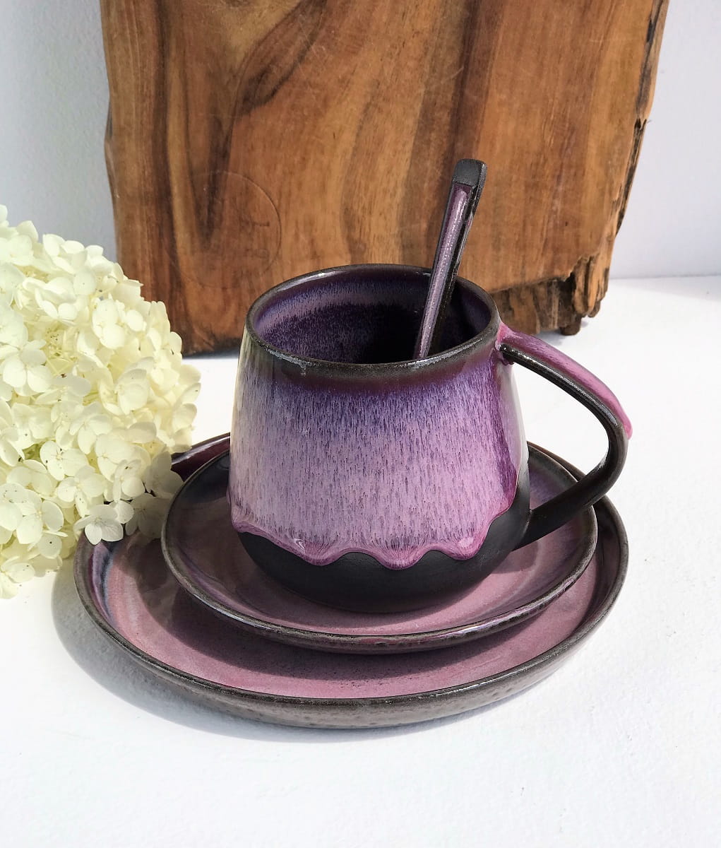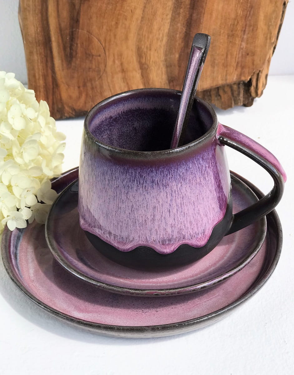 Zestaw wykonany jest z czekoladowo-brązowej masy ceramicznej i pokryty szkliwami w odcieniach różu i fioletu.